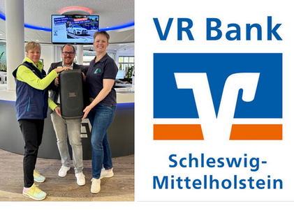 Jann Bittermann (Leiter der Filiale Nortorf) überreichte den Verstärker von JBL an die Mitglieder des Teamvorstandes Josie Rohwer und Heike Hebbeln.