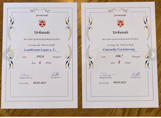 Bei der Siegerehrung des Gemeindepokalschießen Jevenstedt haben Josie Rohwer und Andrea Vollert Glückwünsche und Urkunden von Bürgermeister Sönke Schwager für den 6. Platz der Landfrauen und für den 8. Platz des Concordia-Versicherungsbüro König entgegengenommen. Insgesamt haben 421 Schützen für 17 Mannschaften bei den Vereinen und 18 Teams bei den Betreiben teilgenommen.